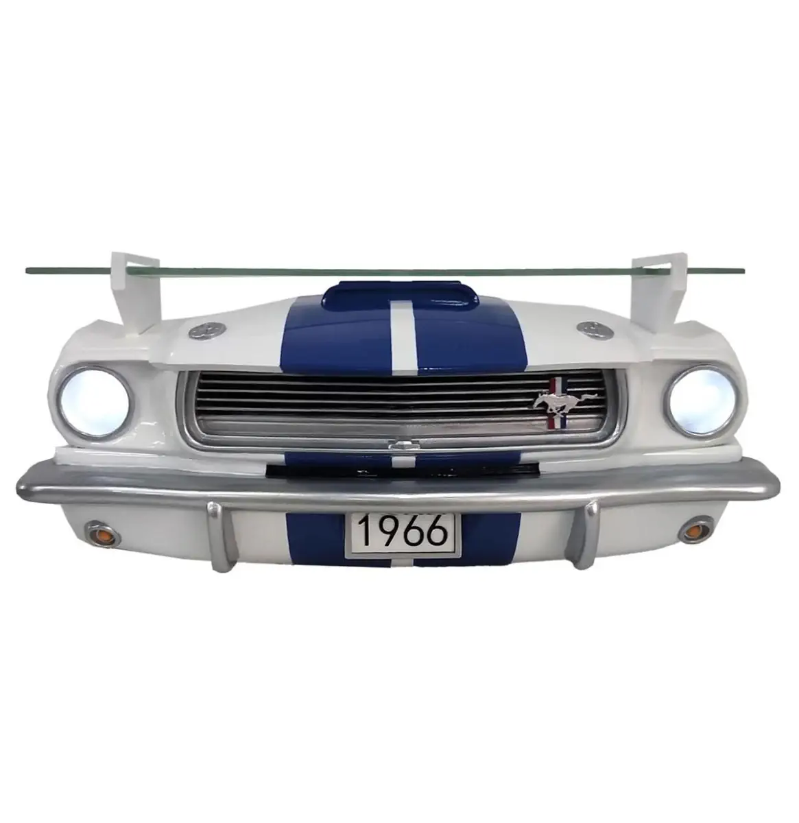 Denne klassiske Mustangen er en 1966 GT 350 støpt i harpiks og håndmalt. En hylle i herdet glass står oppå den velkjente fronten,