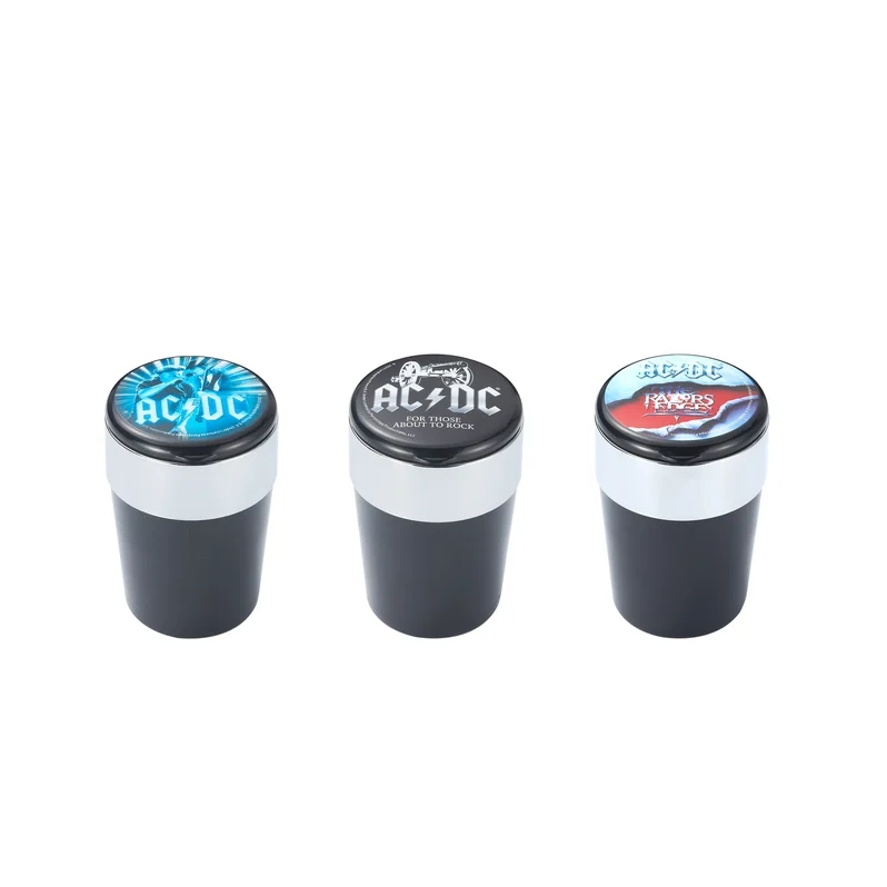 AC/DC-askebegre i plast til bil, 3 forskjellige design. Hvert askebeger er utstyrt med et integrert LED-lys for praktisk bruk selv om natten, samt et inkludert batteri. Kompakt og funksjonelt, passer det enkelt i en koppholder i bilen og holder asken sikkert.