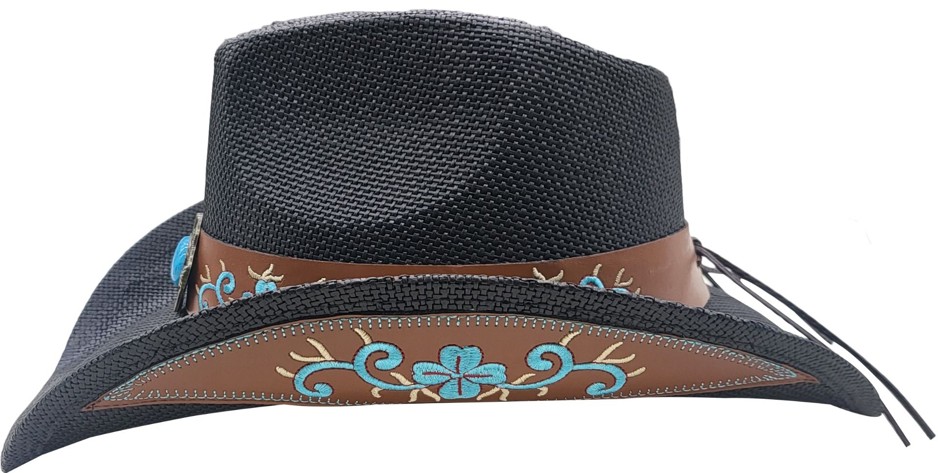 Den fargerike sommercowboyhatten har et livlig design fremhevet av et fargerikt steinbånd, noe som gjør den til et iøynefallende plagg for sesongen. Denne hatten kombinerer vestens eventyrlyst med en strandfølelse, perfekt for å tilføre et fargeinnslag til sommergarderoben din.