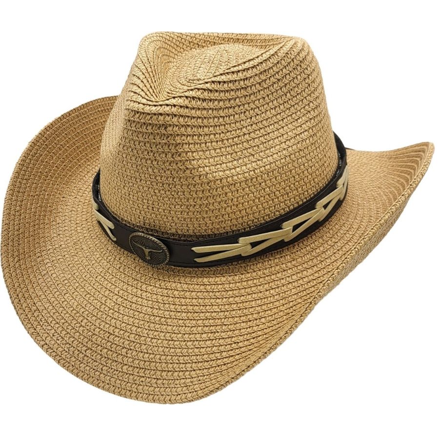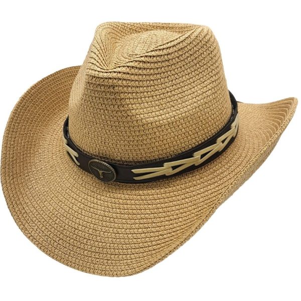 Denne cowboyhatten er laget av papirstrå, perfekt for sommerbruk. Det klassiske designet holder deg kjølig og stilig hele sesongen. Hattens lette og pustende materiale gjør den ideell for utendørsaktiviteter, mens den brede bremmen gir beskyttelse mot solen. Gjør deg klar til å slippe løs din indre cowboy!