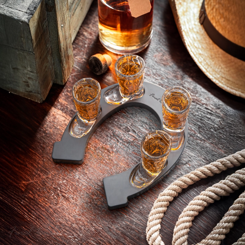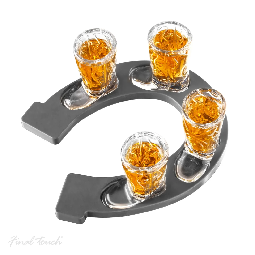 - Includes: 4 boot shot glasses with horseshoe serving tray.