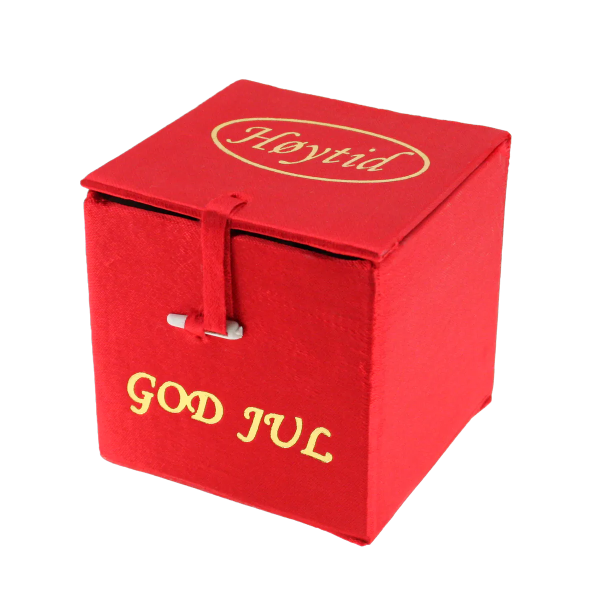 Julekulen er malt for hånd på innsiden av glasset gjennom det lille hullet i toppen. Hver kule kommer i en pen, rød gaveeske med gullskrift på. Da er det ekstra stas å gi bort i gave til noen du er glad i! I tillegg sørger boksen for at det er sikrere og finere å oppbevare kulen når den skal lagres.