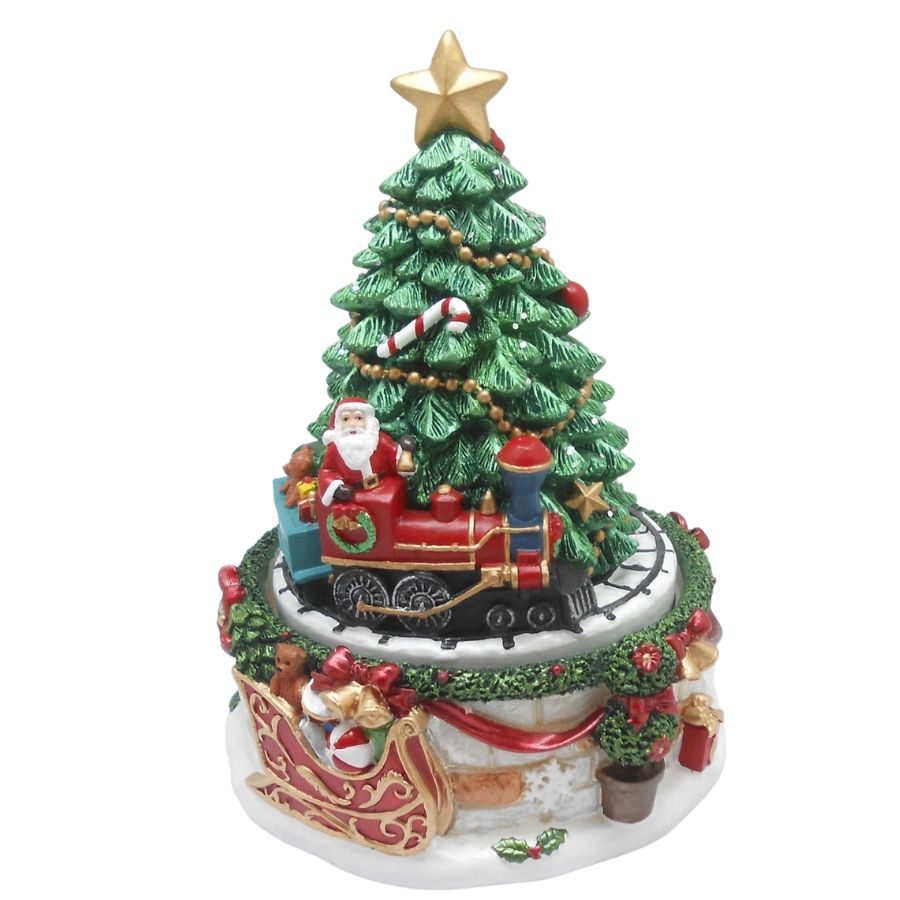 Musikalsk juletre og tog med julenissen. Et lite tog går i sirkler rundt det pyntede juletreet. Basen er dekorert med planter og julenissens slede. Når den mekaniske spilledåsen trekkes opp, roterer treet og toget på basen til melodien «O juletre». Høyde: 16,5 cm