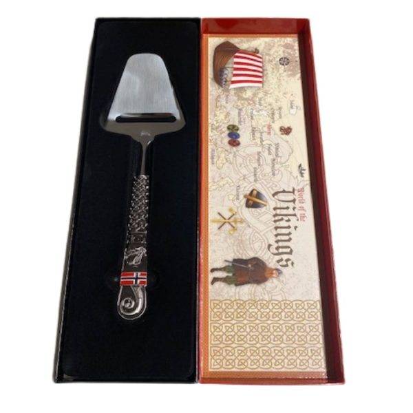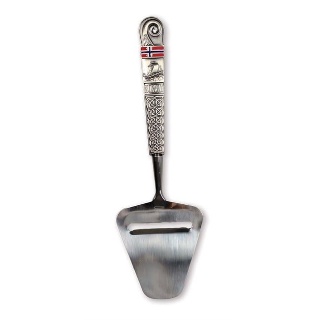Tinn ostehøvel med vikingskip og flagg dekor på skaftet. En flott suvenir fra Norge