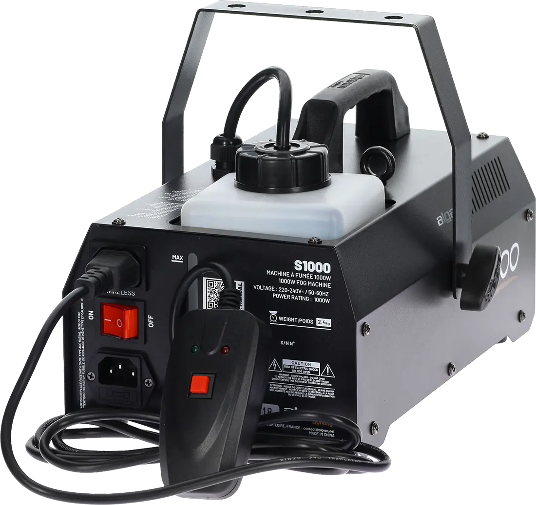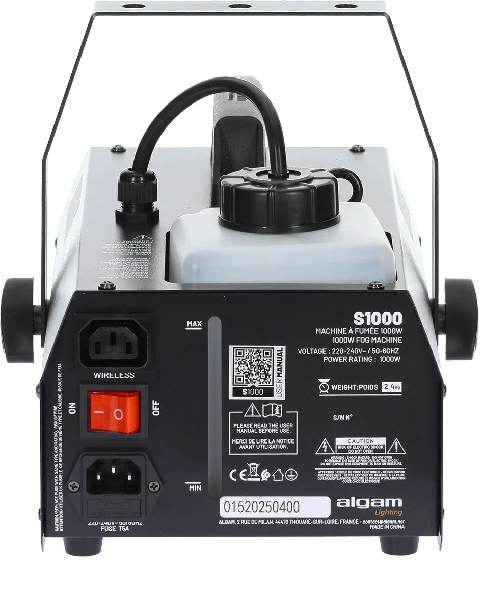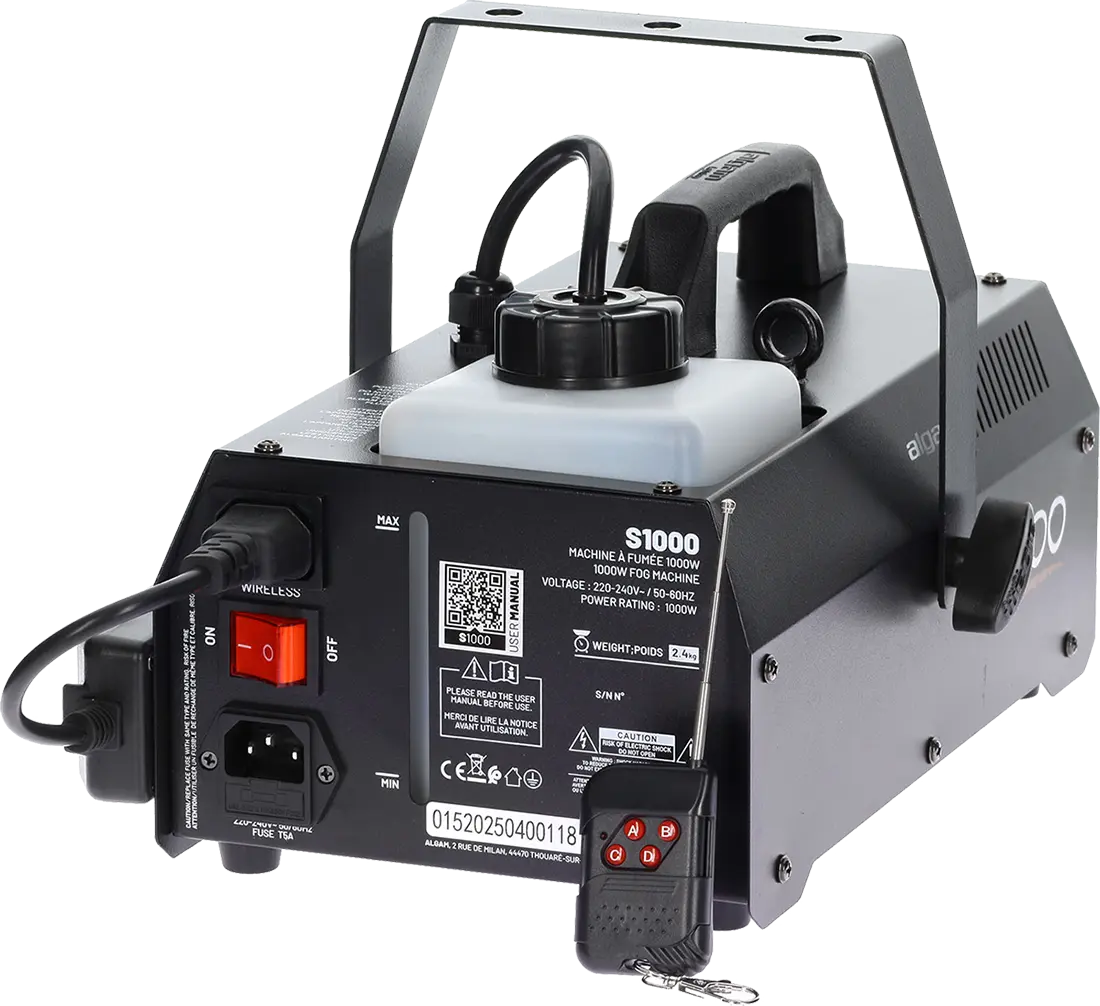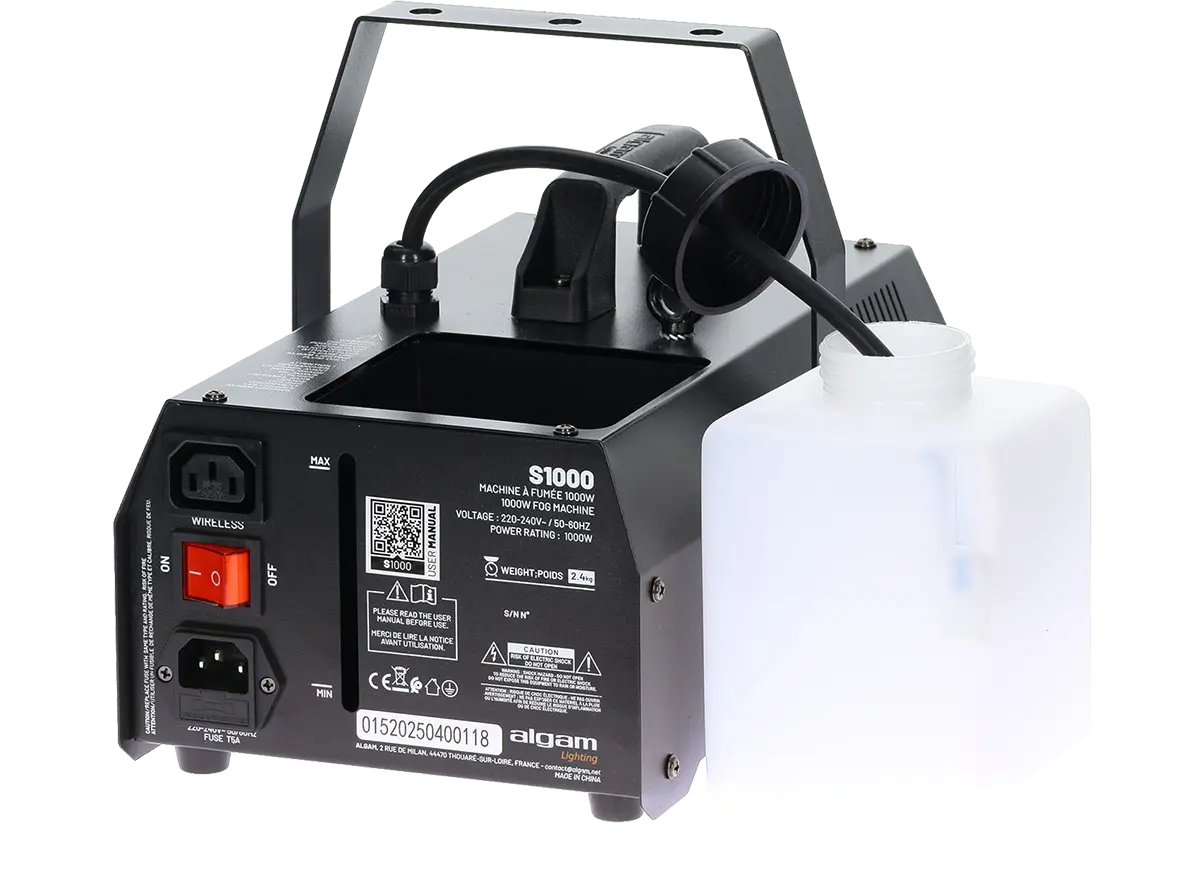 The S1000 is a 1000W fog machine developed by Algam Lighting, designed to create immersive atmospheres at your events. Whether you are a professional event organizer or an amateur looking to set the mood for your parties and showcase your lighting systems, the S1000 is a compact and powerful solution. Beyond its power, this easy-to-use fog machine comes with a wired remote control, as well as a wireless remote control and receiver to dispense fog in all circumstances.