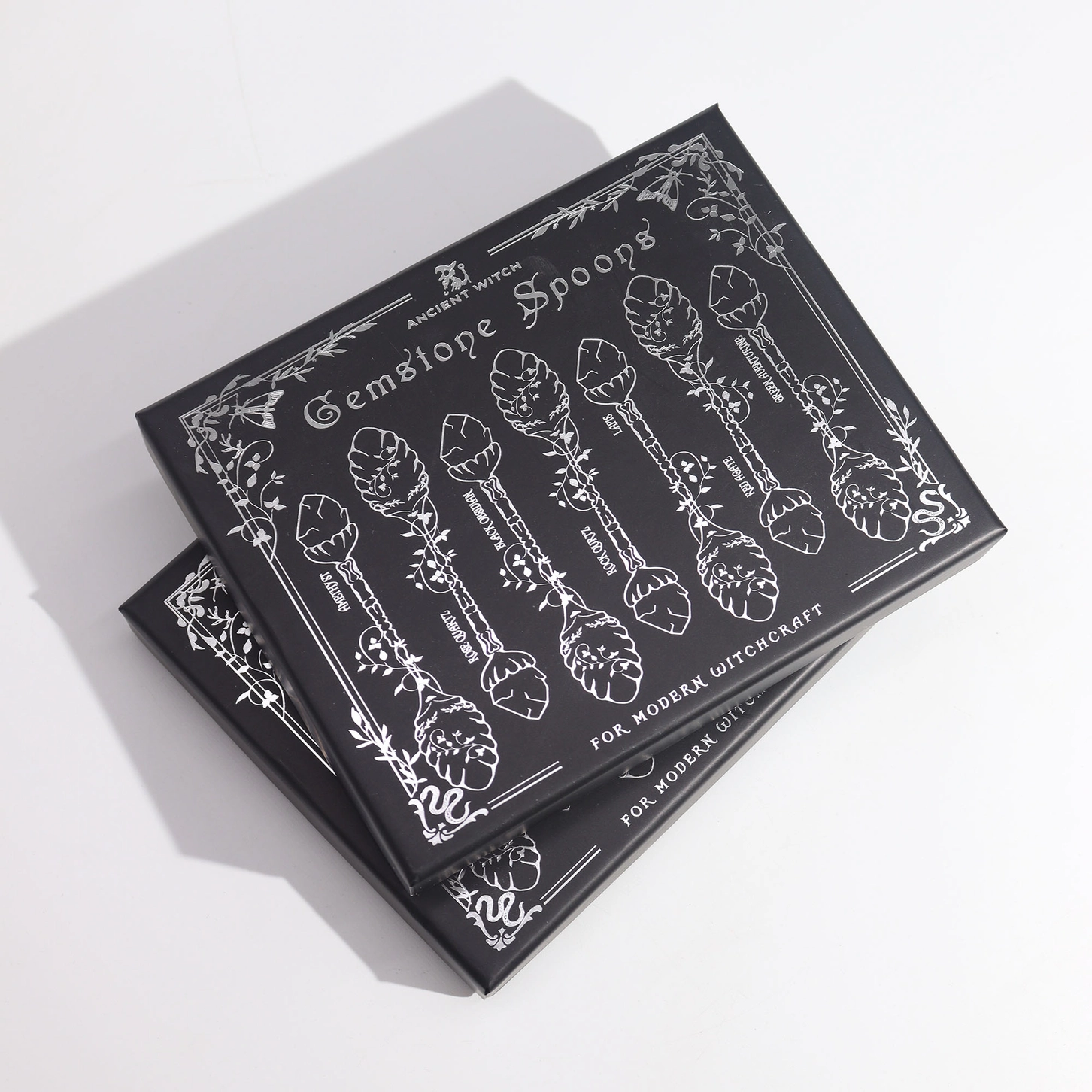 These Gemstone Crystal Witch Spoon Sets offer striking combination of function, symbolism, and mystical aesthetic — ideal for modern witchcraft, tea rituals, altar decor, or as a unique gifting item. Each set includes seven small spoons (approx. 12 cm), each topped with a raw-cut genuine gemstone and finished in a Dark Silver or Bronze colourway. The spoons feature decorative embossed handles and bowls, and are presented in a sleek black gift box (16.5 x 13 cm) with illustrated gemstone names. Whether used as altar tools, spiritual decor, or simply as a thoughtful gift, these spoons are designed to catch the eye and spark curiosity. Each set includes the following gemstones: Amethyst – Calm & intuition, Rose Quartz – Love & compassion, Black Obsidian – Protection & grounding, Rock Quartz – Clarity & amplification, Lapis Lazuli – Wisdom & truth, Red Agate – Courage & vitality, Green Aventurine – Luck & abundance.