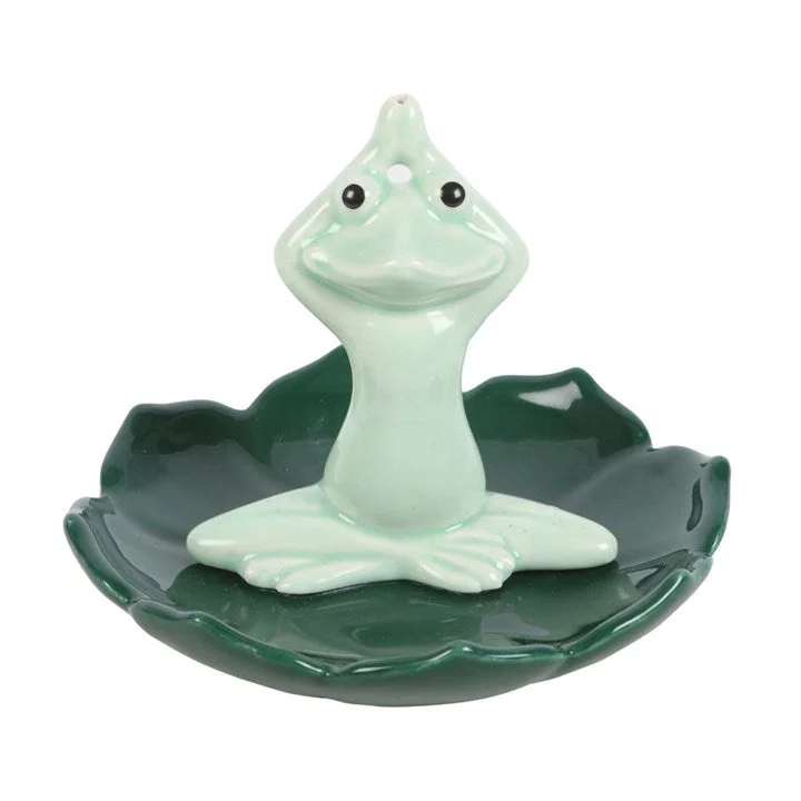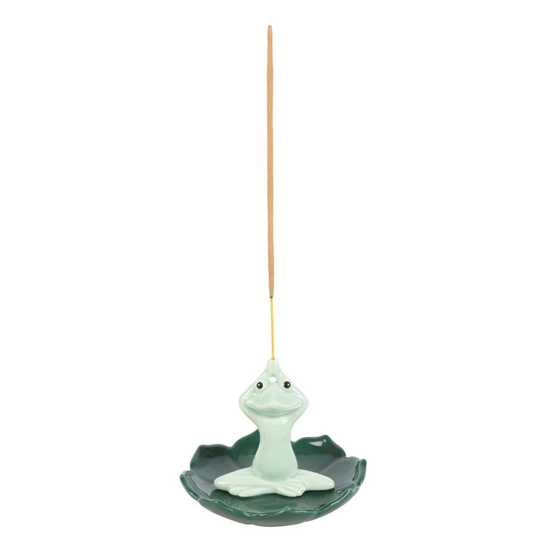 Ro ned nervene og juster chakraene dine med denne keramiske røkelsesholderen formet som en yogifrosk. Sittende i en sukhasana-positur i en grønn lotusblomst, vil denne keramiske holderen se sjarmerende ut på et sidebord eller nattbord mens den fanger opp fallende aske.