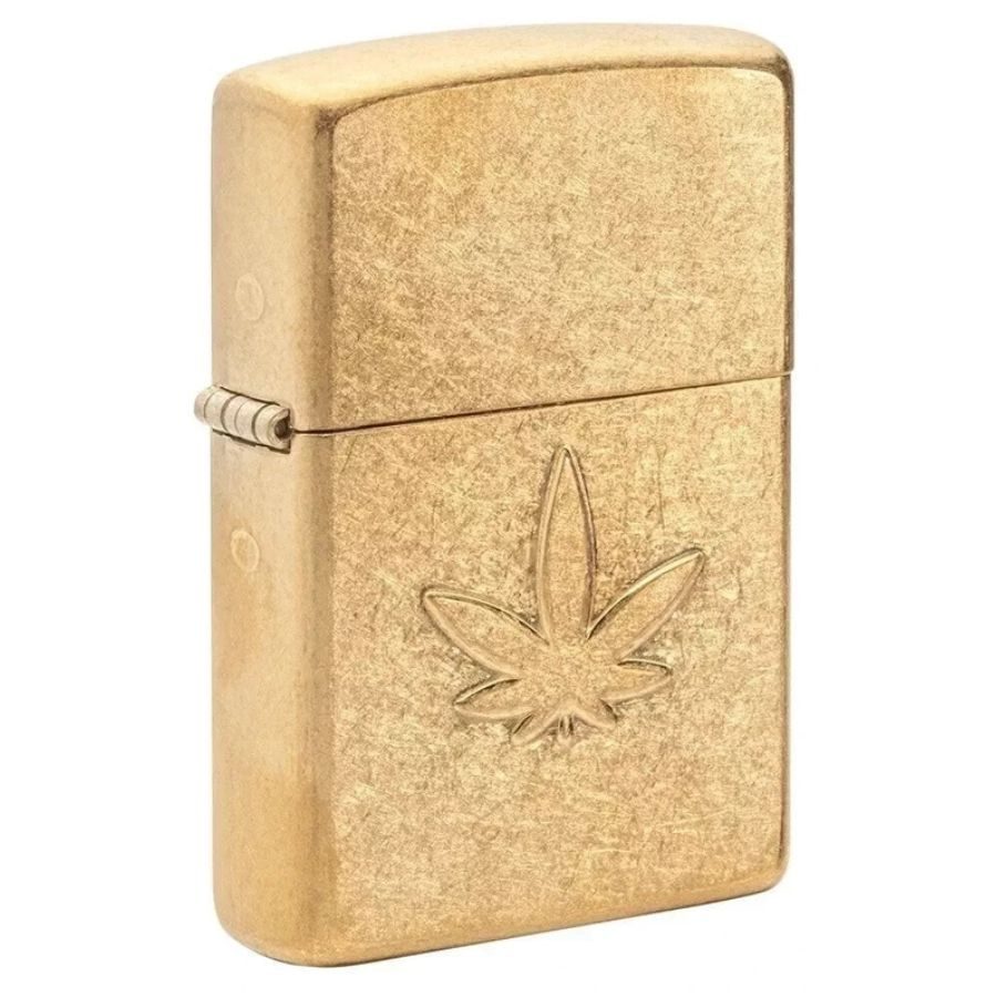 Zippo Lighter Stamped Cannabis Leaf, Tumbled Brass Finish
